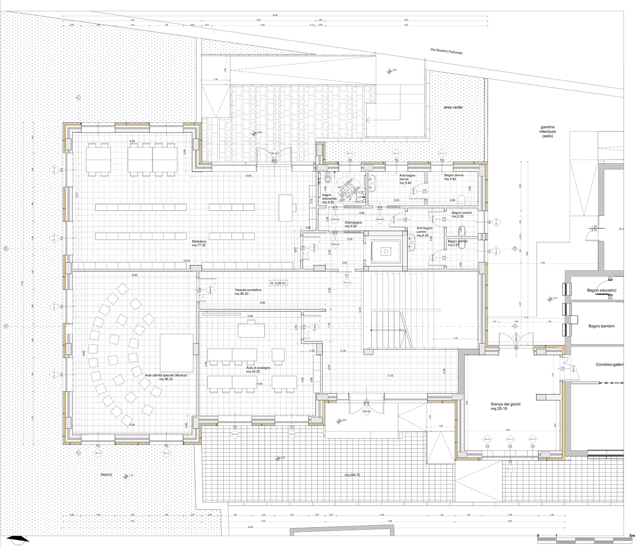Nello specifico, infatti, sono state previste nuove aule didattiche a servizio della Scuola Media, ambienti destinati ad ospitare attività speciali, quali laboratori di musica, arte, di supporto alla disabilità, ed una biblioteca. Quest’ultima fruibile anche oltre l’orario scolastico, avendo un ulteriore accesso indipendente dall’esterno, su via Giustino Fortunato.